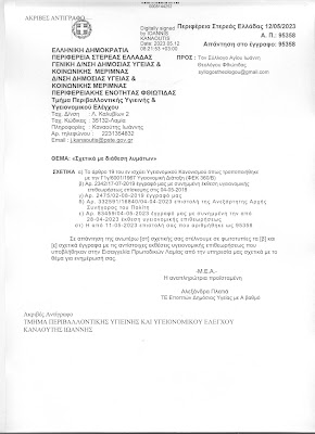 Στα έγγραφα που ακολουθούν θα διαπιστώσετε πως ήδη έχουν σταλεί για δεύτερη φορά στις 4-5 2023 (η πρώτη ήταν του 2019) στον Εισαγγελέα Πρωτοδικών Λαμίας οι εκθέσεις υγειονομικής επιθεωρήσεως που αφορούν τη δημιουργία ανθυγιεινών εστιών ακαθάρτων υδάτων σε αγωγό ομβρίων από παράνομες συνδέσεις δημοτών του Δήμου Λοκρών.